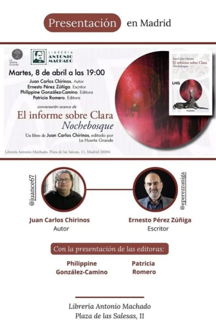 Juan Carlos Chirinos (Valera, 1967), novelista, cuentista, biógrafo, ensayista, dramaturgo, guionista y profesor, presenta su última obra El informe sobre Clara. Nochebosque, editado por La Huerta Grande, en la la librería Antonio Machado de Madrid.